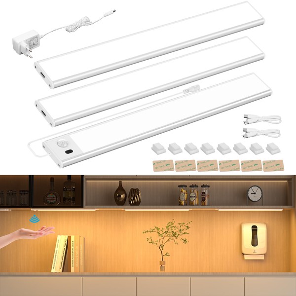 Under-Unit Light Kitchen LED, 30 cm x 3 Pieces LED Cabinet Lighting with Hand Sweep Sensor, LED Under-Unit Light with Night Sensor, Warm White Kitchen Under-Unit Light with Plug for Shelves,