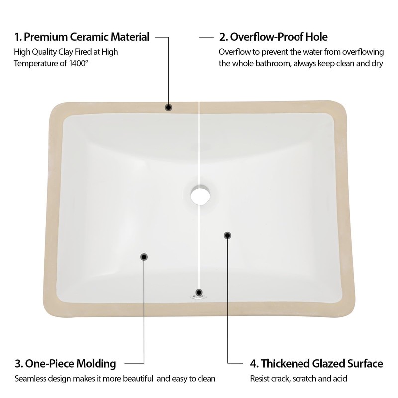 - Durability: Crafted from high-quality ceramic with superior workmanship, this 21-inch undermount bathroom sink features an extra smooth and glossy polished surface. It effectively resists scratches, is easy to clean, and ensures long-lasting durability.