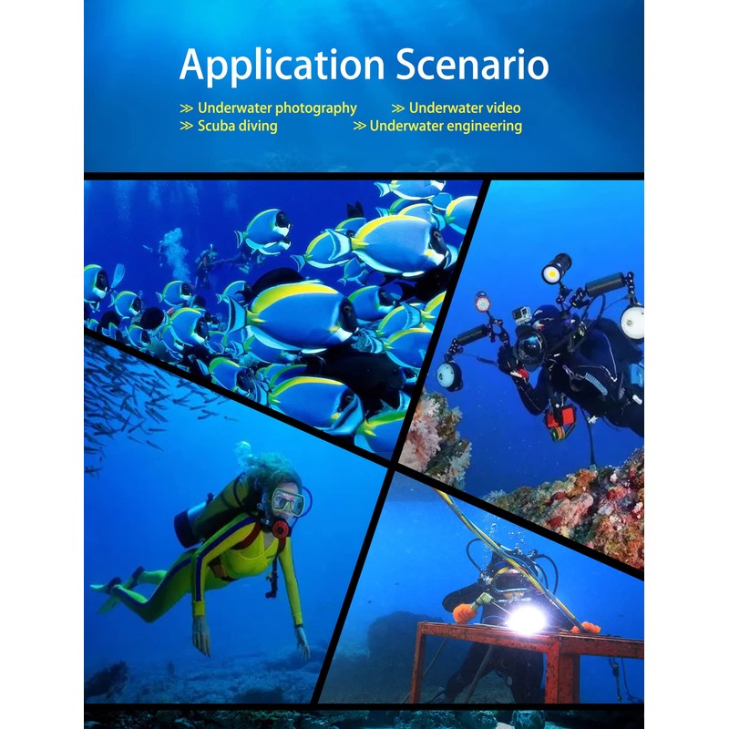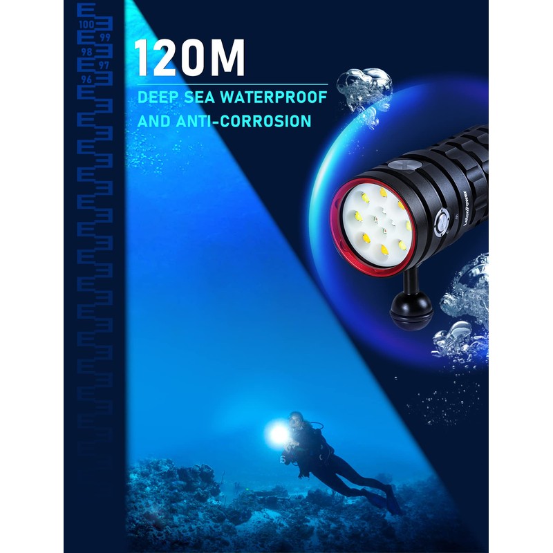 - MULTIPLE LIGHTING SOURCES: Turbo S pro is an excellent choice for scuba diving lighting, underwater video and outdoor event lighting. In addition to the beam of 6500K, 13,000 lumens of beam, the blue and red light can be used to highly reproduce the original color of the subject. The illumination angle is 120°, providing sufficient illumination for a wide area