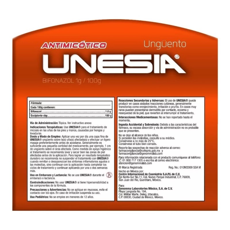 Unesia es un ANTIMICÓTICO en presentación UNGÜENTO indicado en el TRATAMIENTO de micótico en las UÑAS de los PIES y MANOS causadas por HONGOS y LEVADURAS. Ayuda a recuperar la DUREZA y COLORACIÓN de la uña. Ataca al hongo que ocasiona la UÑA AMARILLA. Caja con tubo de 20 g.