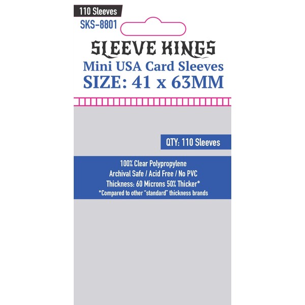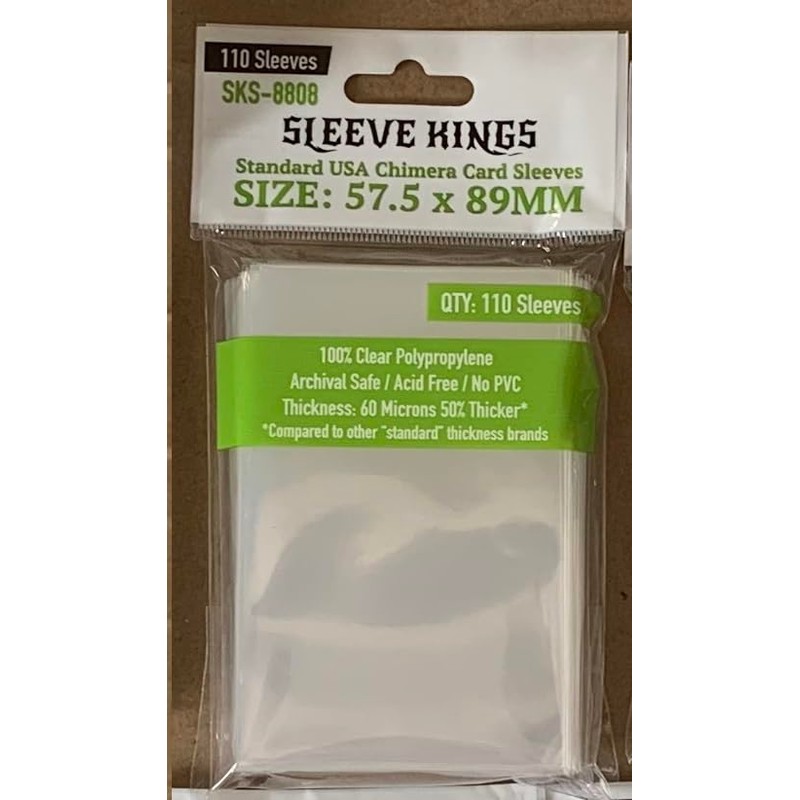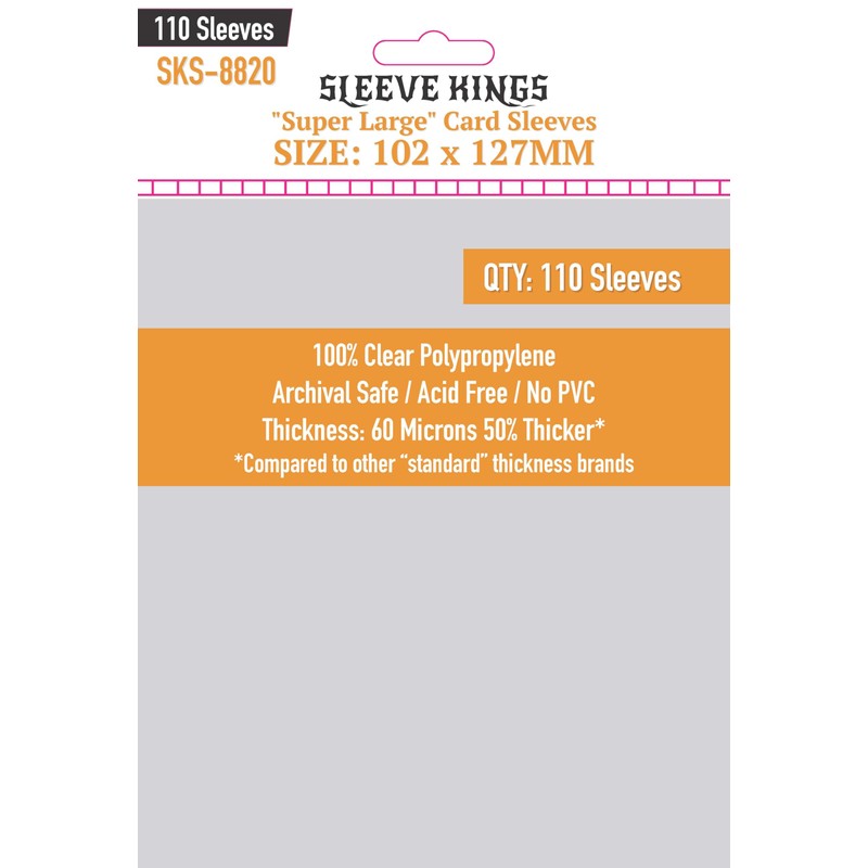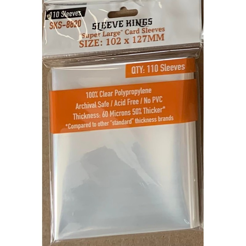 • Sleeve Kings are 60 micron sleeves which are ideal for games where you have a lot of cards. Thicker card sleeves are nice but getting the cards back in the box and handling hugely overstacked decks is a big issue on games over 100 cards.