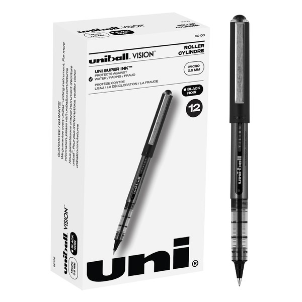 Uniball Vision Rollerball Pens, Black Pens Pack of 12, Fine Point Pens with 0.5mm Micro Tip Ink Pen, Pens Fine Point Smooth Writing Pens, Bulk Pens, and Office Supplies