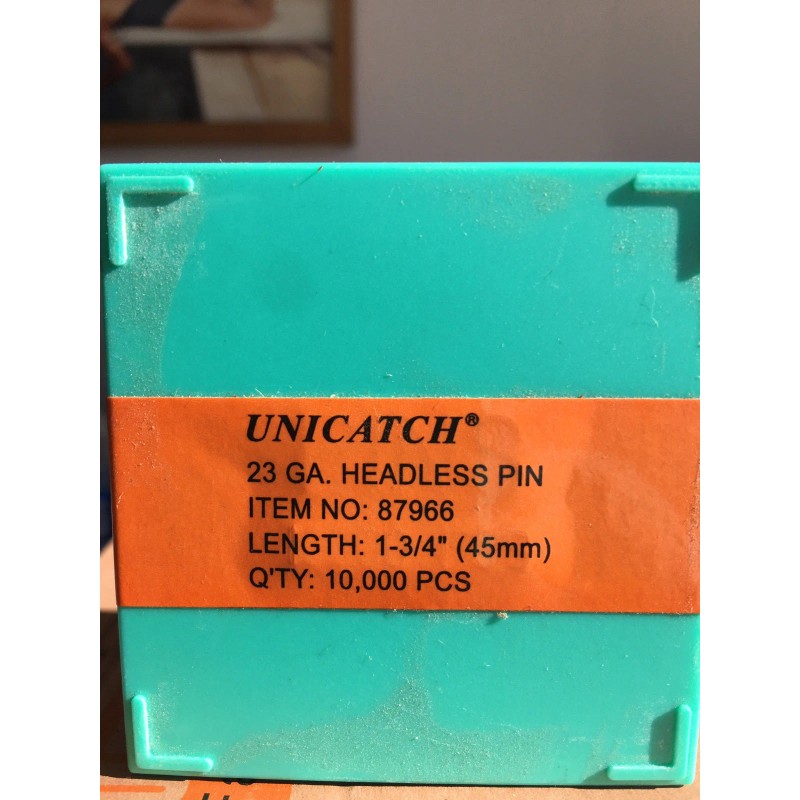 Because 23 gauge pins are extreamely fine, setting high standards for each of these attributes is much more critical than traditional finish nails such as 18 and 16 gauge brads. All of Unicatch's pins are manufactured and tested for the tightest tolerances. You get a box of 10,000