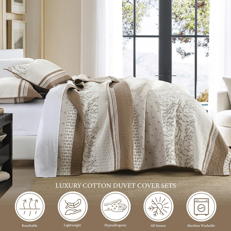 Uniclinens 100% Cotton Quilt Set Queen Size, Patchwork Quilts Bedding Set Bedspreads, Botanical Pattern Coverlet, Farmhouse Striped Floral Quilted Quilt Lightweight Comforter, White/Brown