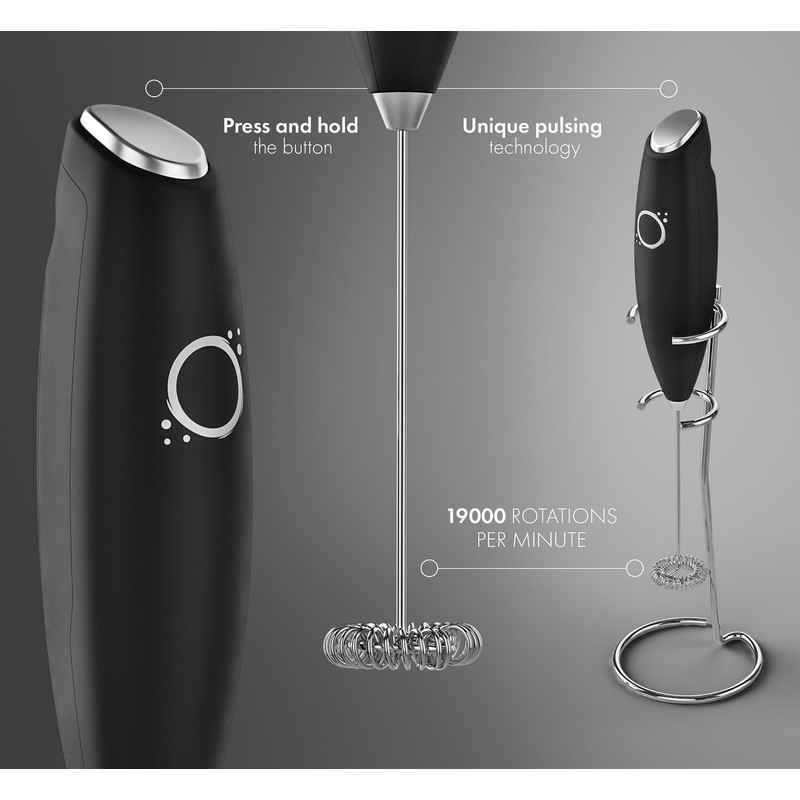 - Tecnología única de empuje: este espumador utiliza una avanzada tecnología de pulsación de batidor para crear una hermosa espuma cremosa de tu leche con solo pulsar un botón. El fabricante de café con leche es inalámbrico y portátil también, solo necesitas pilas AA (no incluidas) para alimentar tu espumador de leche.