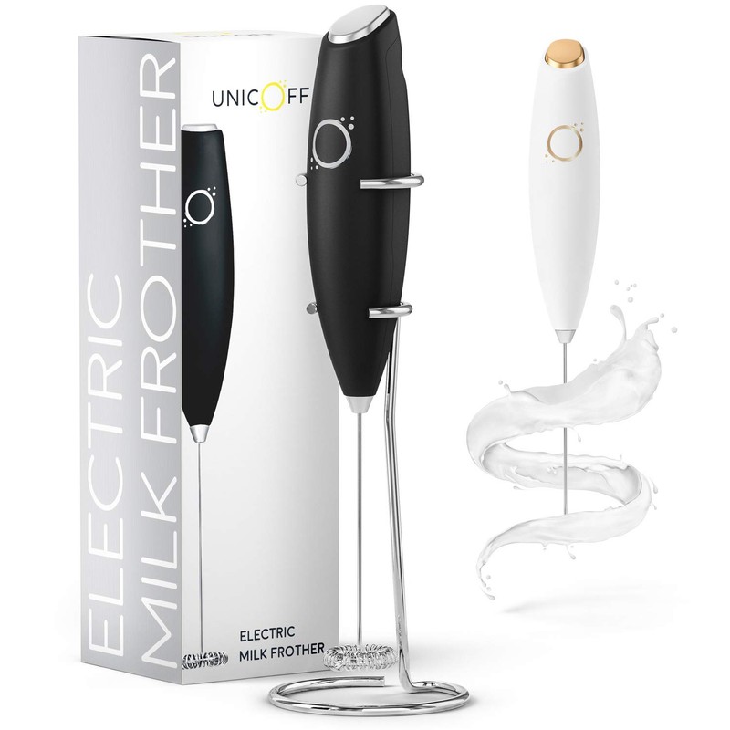 Unicoff - Espumador de leche, cafetera para capuchino, cafetera para café con leche, minibatidora de bebidas, espumador eléctrico, espumador de café, recetas e instrucciones adicionales incluidas con el espumador de leche, espumador de leche de almendras