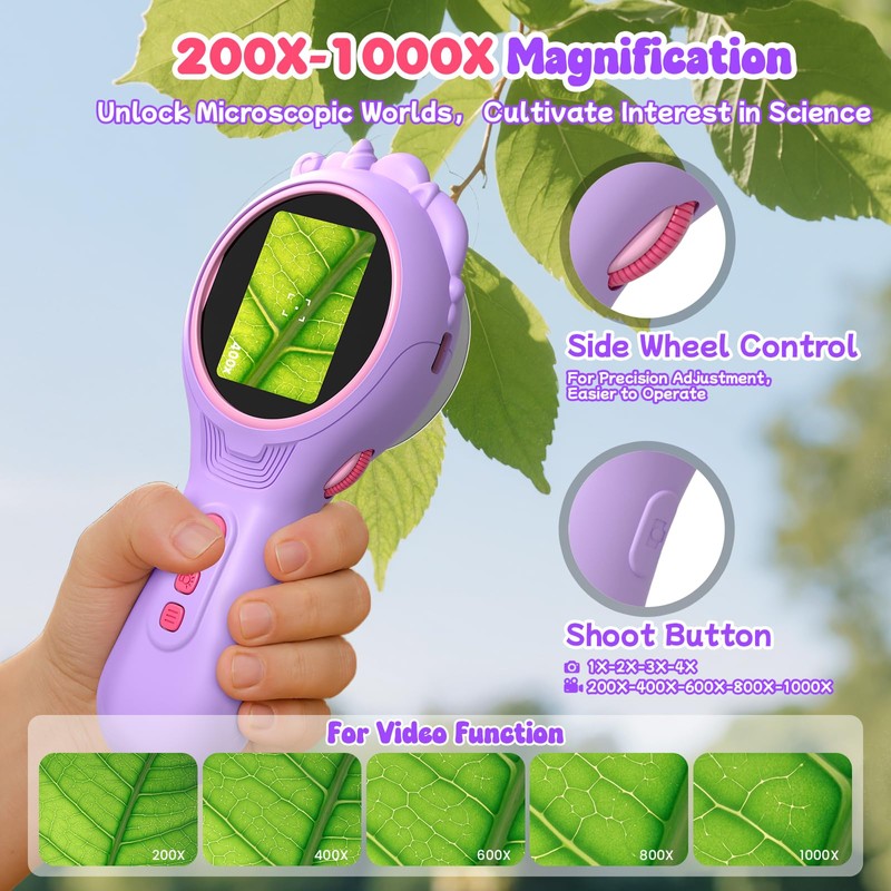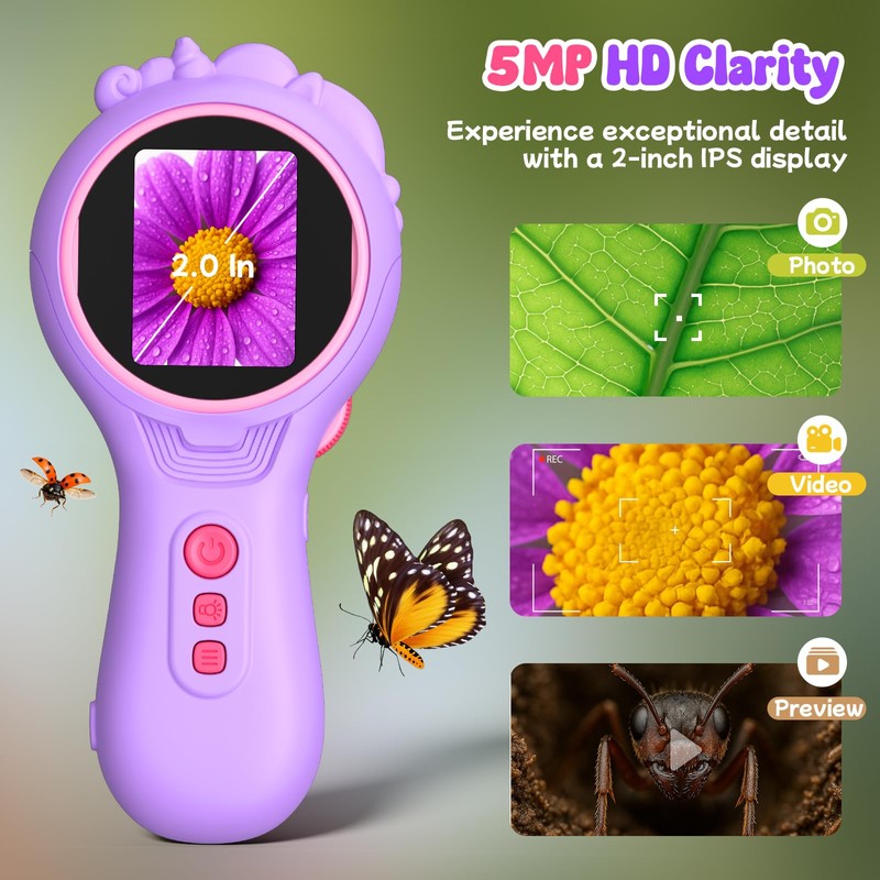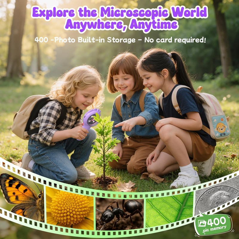 - 【Capture Photos & Videos with Ease】Equipped with both photo and video recording functions, kids can document their discoveries in real time. The built-in memory stores up to 400 photos, so little explorers can share their amazing finds with friends, family, or classmates anytime—no extra memory card needed