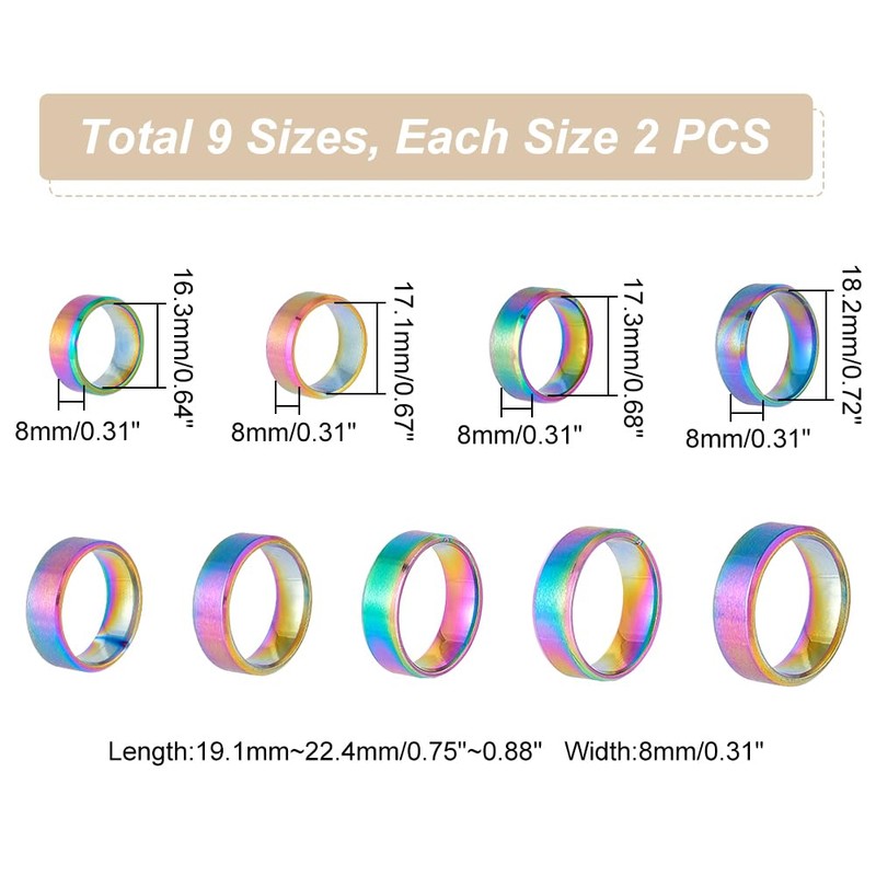 - 9 tamaños: recibirás 18 anillos de acero inoxidable, en tamaño 5/6/8/9/10/11/12/13, 2 piezas para cada tamaño. Puedes elegir diferentes tamaños para combinar con tus atuendos diarios, dando a las personas una experiencia visual diferente.