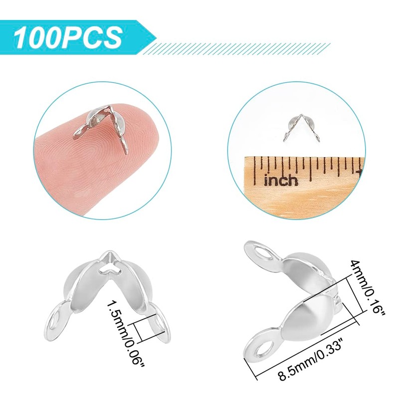 - Package includes: comes with 100 pieces bead tips, are typically used at the end of the bead strand as a terminator, perfect as a knot concealer, cord end or bead end. Size: approx. 4 mm long, 8.5 mm wide, hole: 1.5 mm