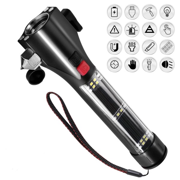 - 🔦【All in 1 Flashlights for Emergencies】All-IN-1 Car emergency flashlight, includes: window breaker, seatbelt cutter, red and blue SOS flashing, 3-mode alarm rescue, solar charging, 3-mode led flashlight, 2-modes of side light, USB charging, mobile power bank, powerful magnet, portable design.