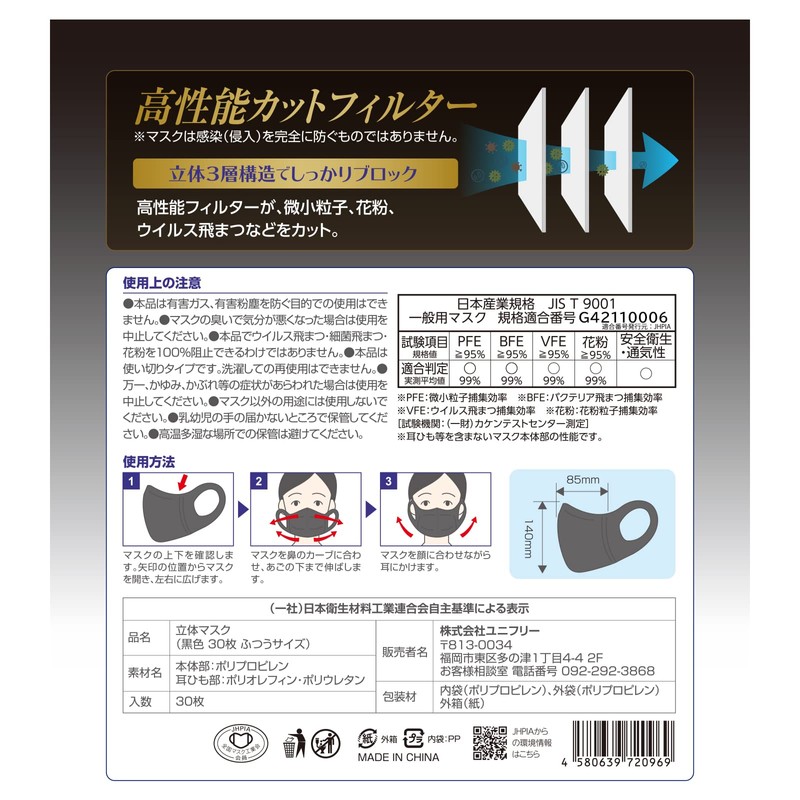UNIFREE 3D Masks, Black, 30 Pieces, Non-woven Mask, Uni-Free, Black (30 Masks)