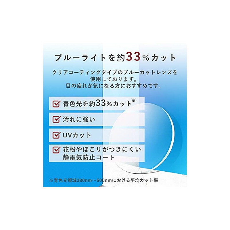 - 【レンズ機能】〇特殊コーティングによりブルーライトを約33%カット (青色光領域380nm?500nmにおける平均カット率)〇UVカット〇ほこりや花粉をつきにくくする静電気防止コートを標準装備〇汚れに強いCSコートを標準装備