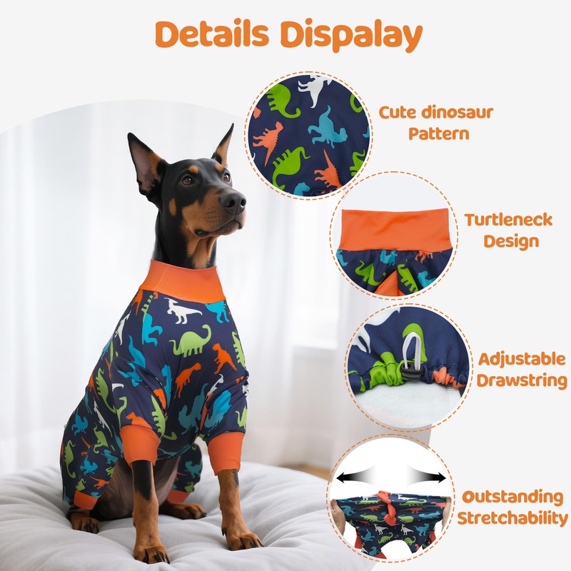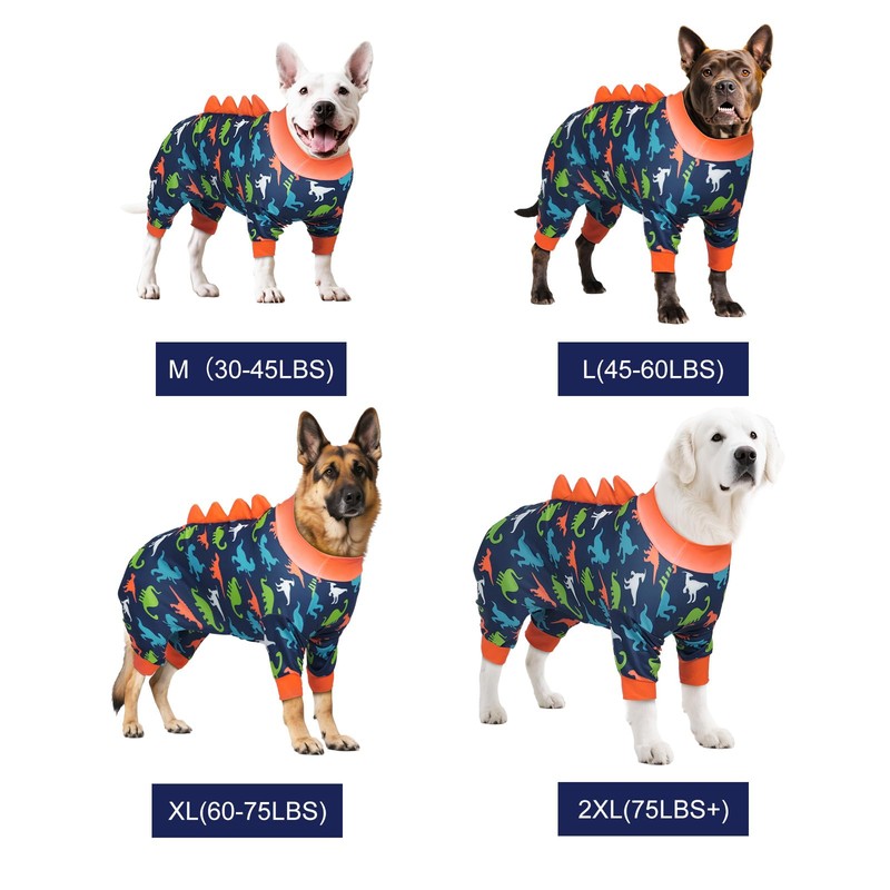 - FUNNY DINOSAUR DECORATION DESIGN - This large dog pajamas uses soft cotton material and cute print design. The back is designed with funny dinosaur decoration. It is very suitable for dogs as pjs or party costumes. There is no doubt that your dog will be the most eye-catching.