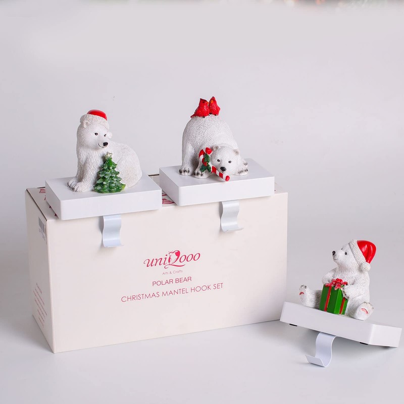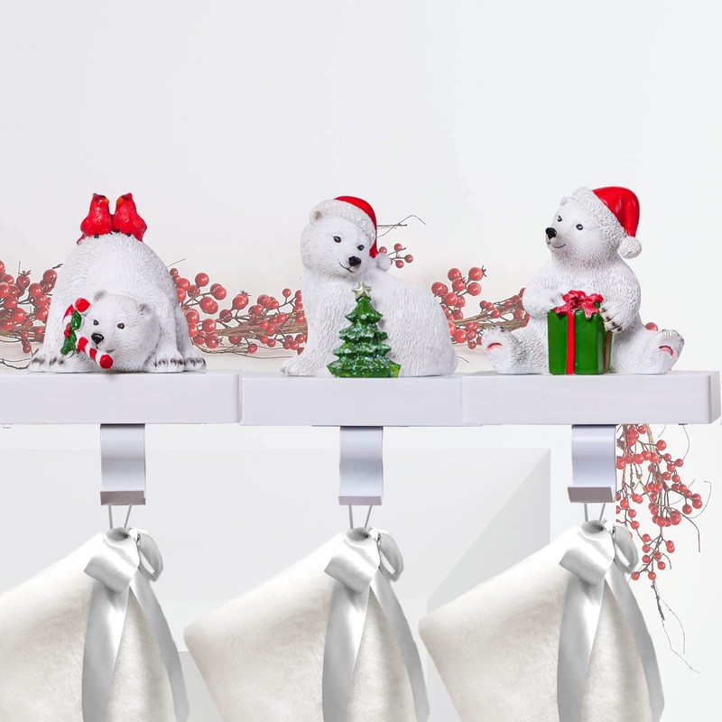 UNIQOOO Handmade White Polar Bear Christmas Stocking Holders, Large 3Pcs Mantel Hook Set with Base Pads, Holds 2 Lb, Cubs with Xmas Tree, Candy Cane, Birds Fireplace Stocking Hanger Décor for Garlands