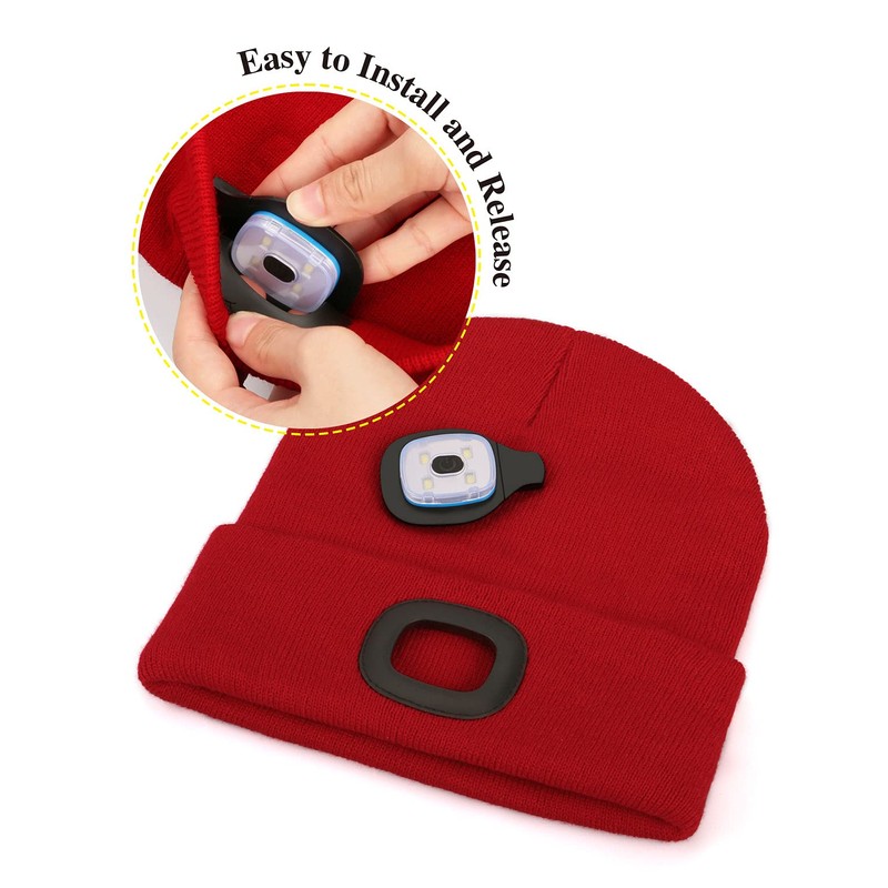 Unisex Beanie Hat with Light, USB Rechargeable Hands Free LED Headlamp Hat, Knitted Night Light Beanie Cap Flashlight Hat, Men Gifts for Dad Father Husband (Red)
