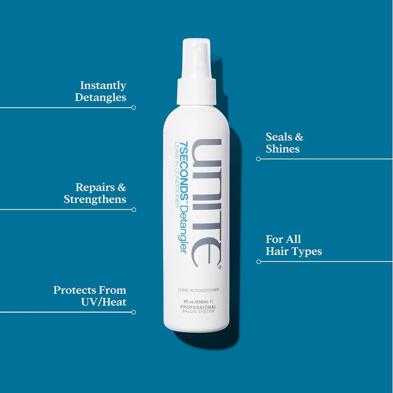 Product Description SECONDS Detangler instantly detangles, preps and protects hair. This protein-based formula leaves hair strong and healthy. It also seals the cuticle and protects hair from heat and UV. A must-have for all hair types Brand Story UNITE is a Professional Salon Hair Care System developed by a hairdresser for hairdressers, with over high-quality, high-performance formulas top salon and editorial stylists demand for their craft, and for their clients.