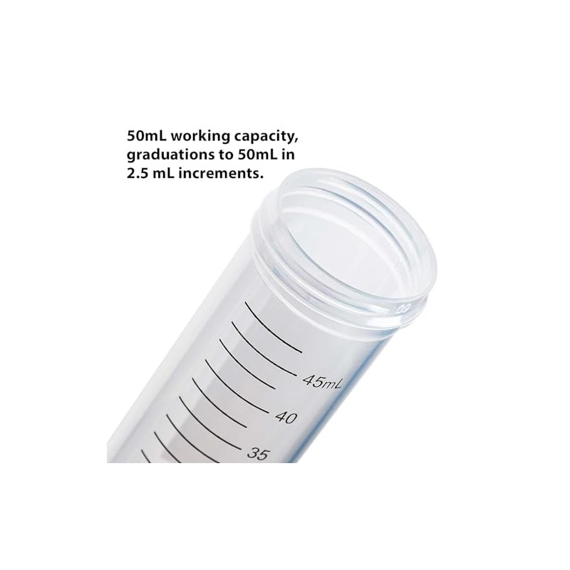 - Pack of 50 polypropylene centrifuge tubes with conical bottom and 50ml capacity; leak-proof, blue HDPE screw caps included