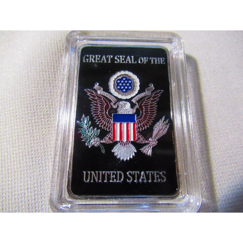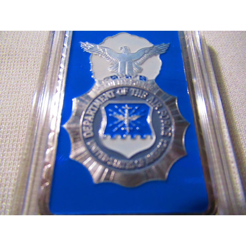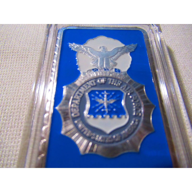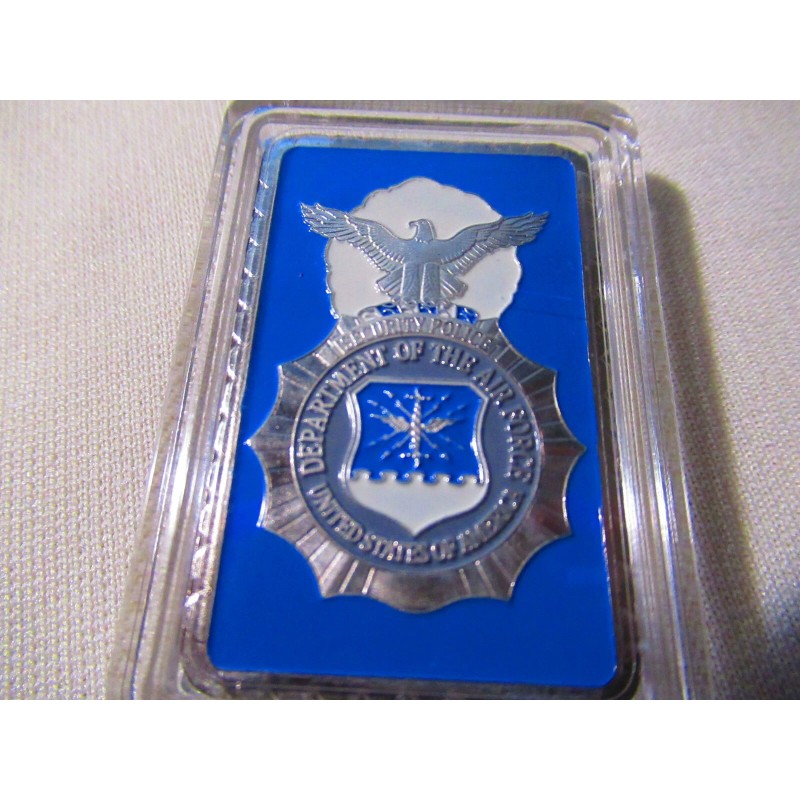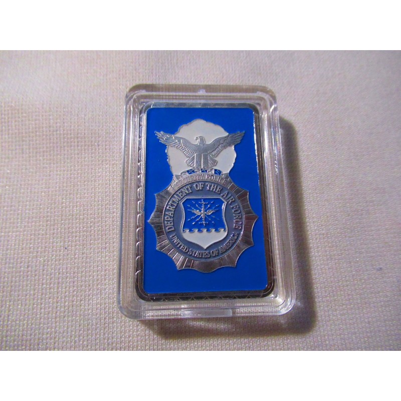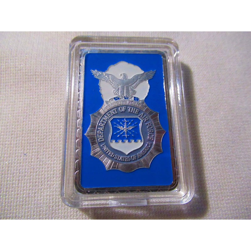This is a great looking United States Air Force Security Forces commemorative challenge coin. Coin is silver plated base metal. This uniquely shaped rectangular coin (bar) measures 2 1/4" X 1 3/8" and displays a Security Forces badge on front and the Great Seal of the United States on the reverse. Coin is contained in an acrylic snap tight holder.