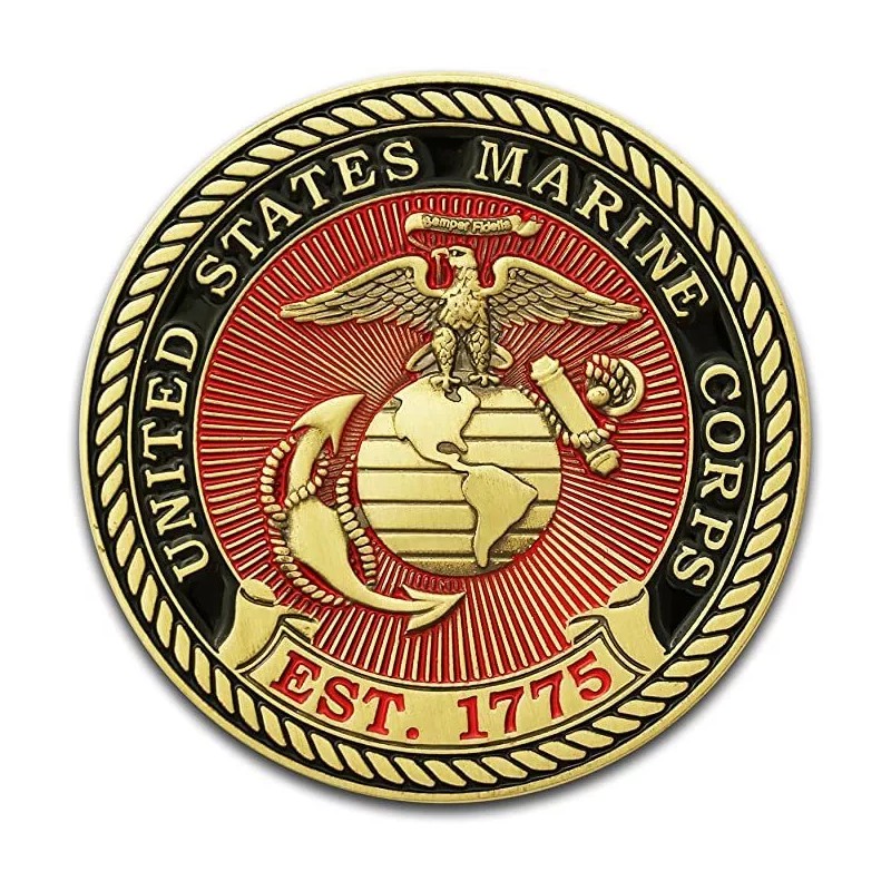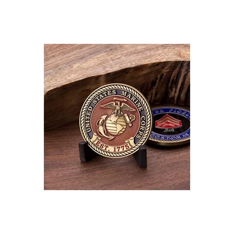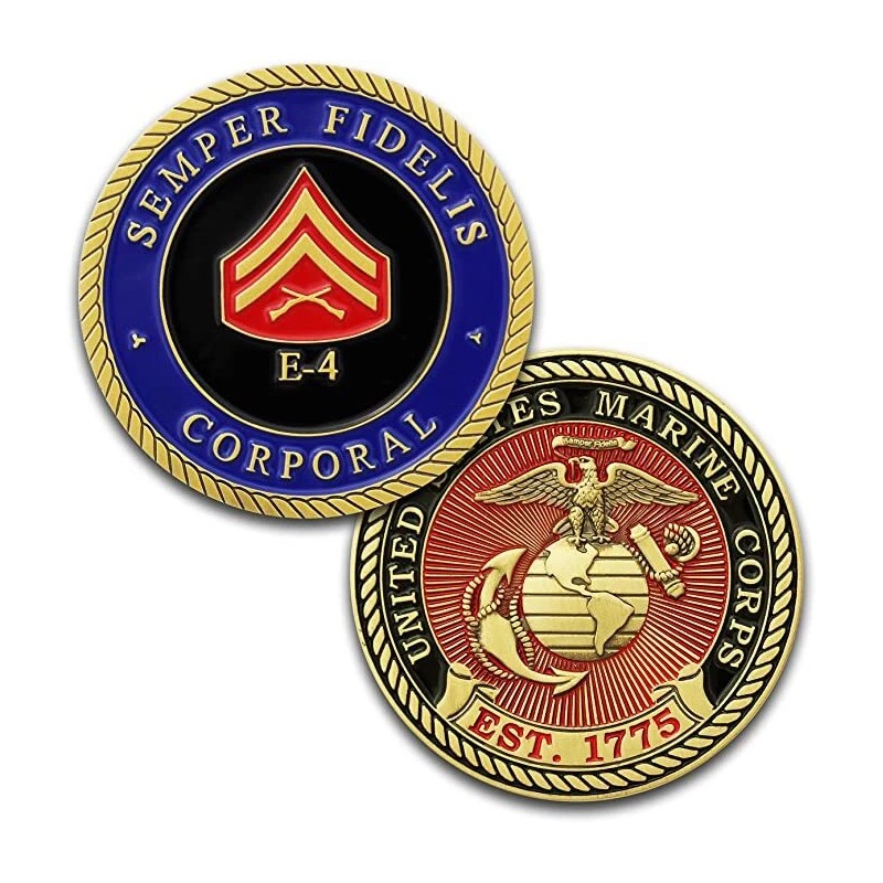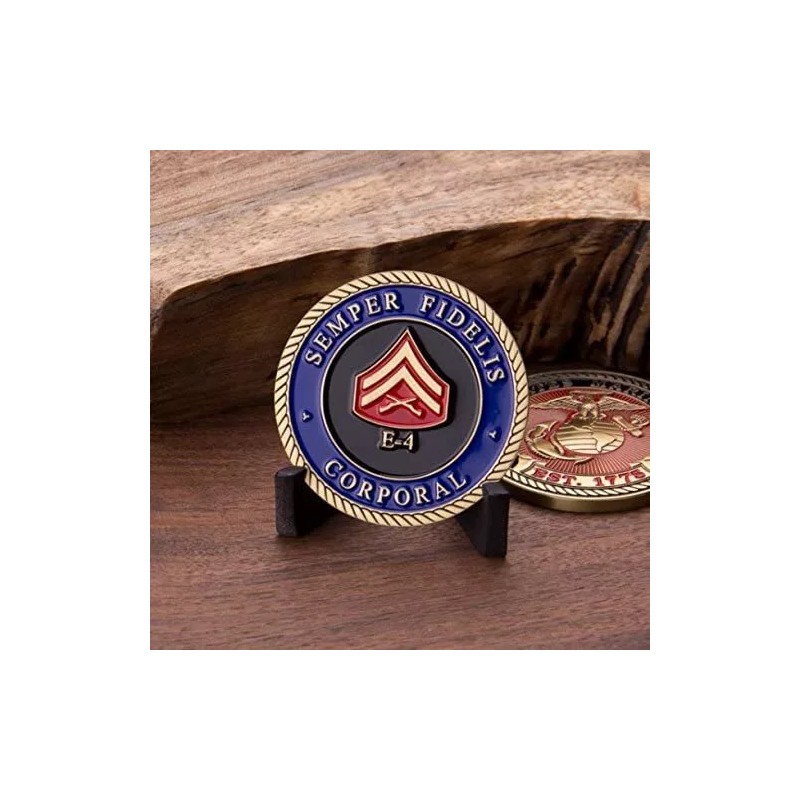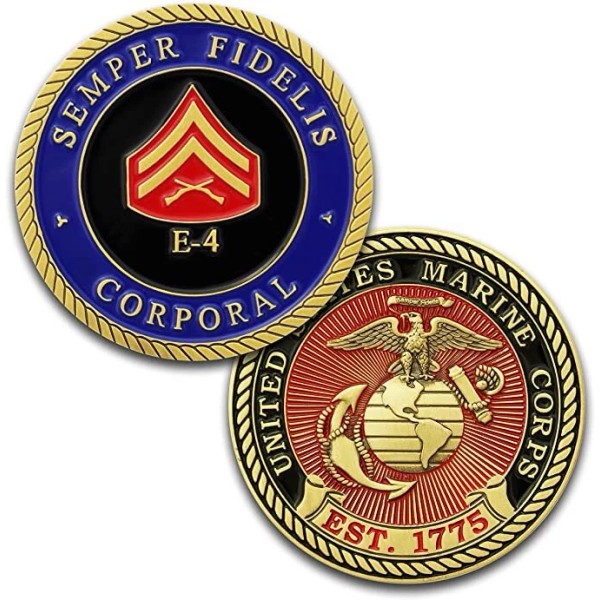 Marine Corporal E4 Challenge Coin This E4 Corporal Marine challenge coin is 1.75" antique brass with a real rope edge. The front of the coin has a blue ring with the words "Semper Fidelis" at the top and "Corporal" at the bottom. The middle of the coin has a black background and features the E4 Corporal Marine rank insignia in full color. The back of the coin has a 3D Eagle, Globe, and Anchor in antique brass on a scarlet background and "United States Marine Corps" surrounding the center.