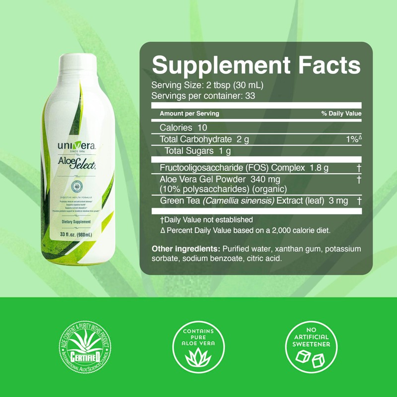 - SUPPORT YOUR DIGESTIVE HEALTH WITH ACTIVALOE: Univera Aloe Select Original contains high quality organic aloe vera processed from the largest aloe vera farms in the world.* The patented concentrate, ACTIValoe, contains 100% hand-harvested peak organic aloe that is derived from the whole aloe leaf, with all the health benefits included. Help your body support your digestive health and nutrient absorption and provide prebiotic support for beneficial intestinal flora growth.*