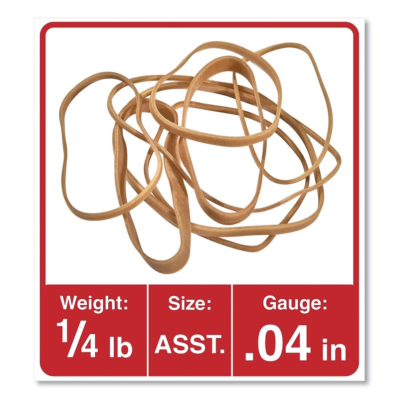General purpose rubber bands for home or office use. Approximate Count: Varies; Size: 54; Length: Assorted; Gauge: Assorted.