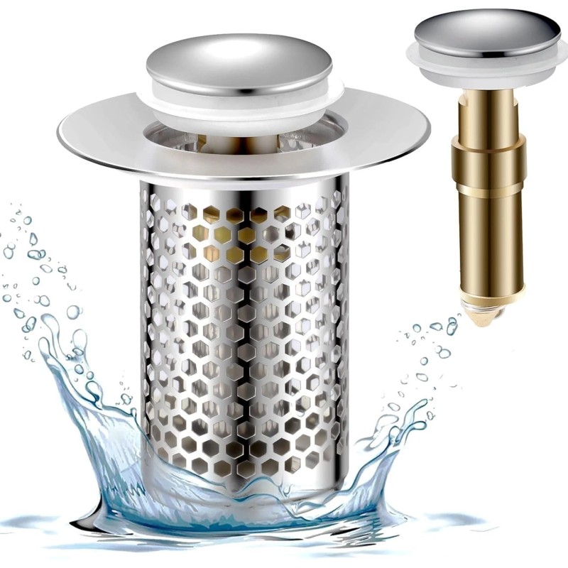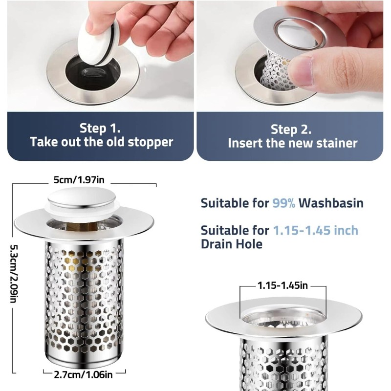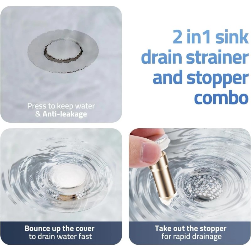 • [2-in-1 Anti-Clogging Design]: Featuring an innovative 2-in-1 design, our sink drain strainer combines a stopper and strainer in one. The anti-clogging basket traps hair, debris, and valuables like jewelry rings before they reach the drain, ensuring hassle-free maintenance.