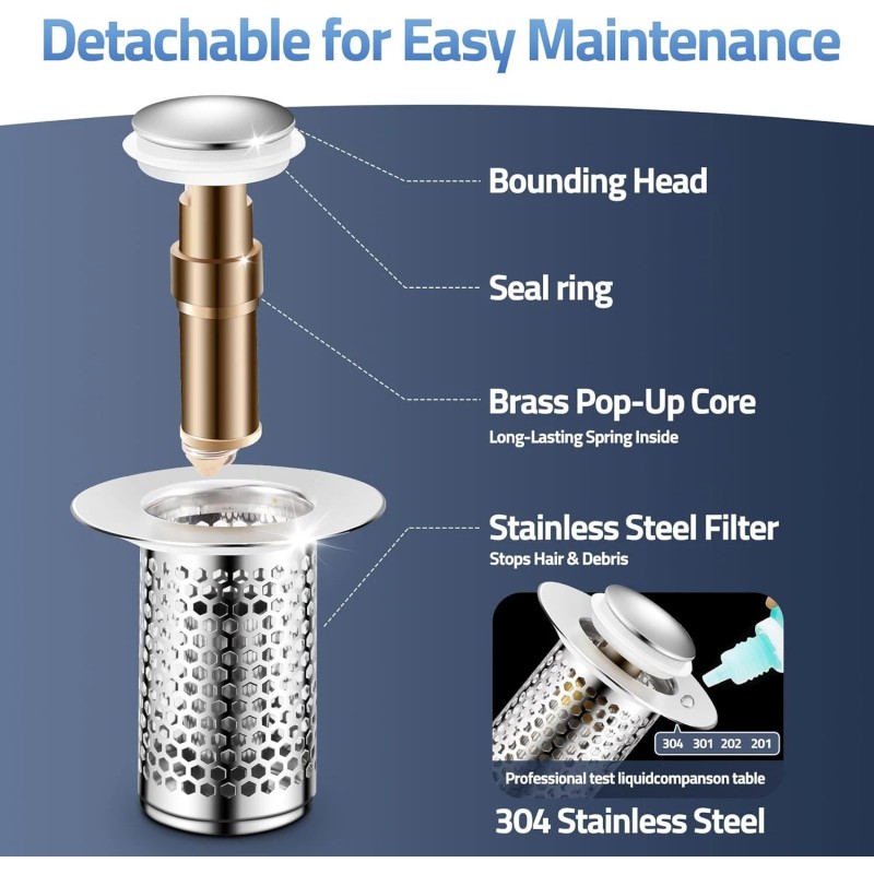 • [Whole Metal, Durable] Our bathroom sink drain hair catchers are all made of high-quality metal. The pop-up core is made of brass, which is strong and durable. The filter screen is made of high-quality 306 stainless steel, which is strong and rust-free, and has a smooth surface won’t hurt your hands.