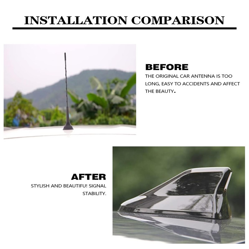 - Self-adhesive Installation: Shark fin antenna no drilling required, all you need to do is clean and dry your car and paste the shark fin antenna on the roof surface. Strong paste, not easy to peel offadopts special car adhesive to paste, do not damage the bodywork, and easy to install without drilling