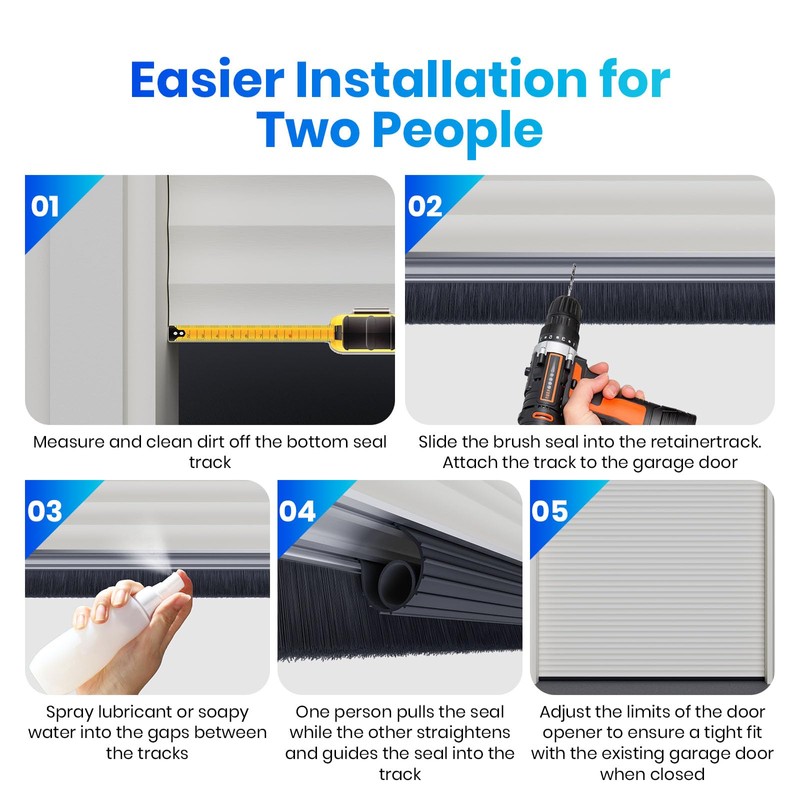 • 【Easy to Install】Installing AQOVOR garage door seal is straightforward. We provide pre-drilled aluminum tracks, making setup easy. Simply clean the garage door's bottom, attach the brush seal to the aluminum track, and secure it to the door. Lubricate the track with lubricant or soapy water before installing the rubber seal for a perfect fit