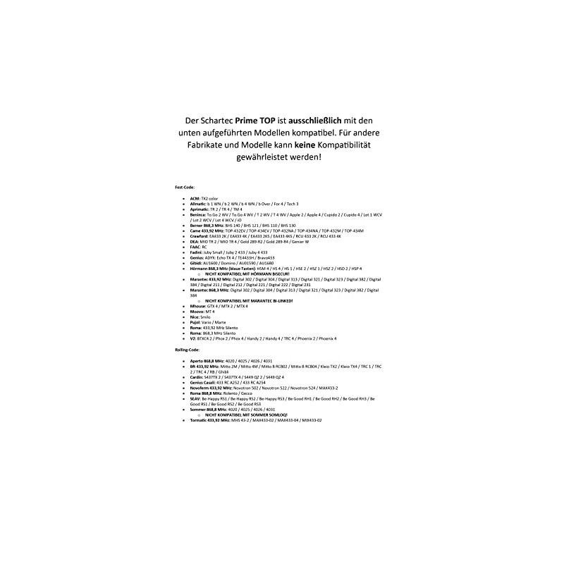 - Original Schartec universal handheld transmitter Prime Top. Compatible with gate operators with 433.92 and 868 MHz, fixed code and rolling code. Please note: The hand-held transmitter is only compatible with the manufacturers and models in the list shown. No other manufacturers or models compatible, even if frequency is the same. !