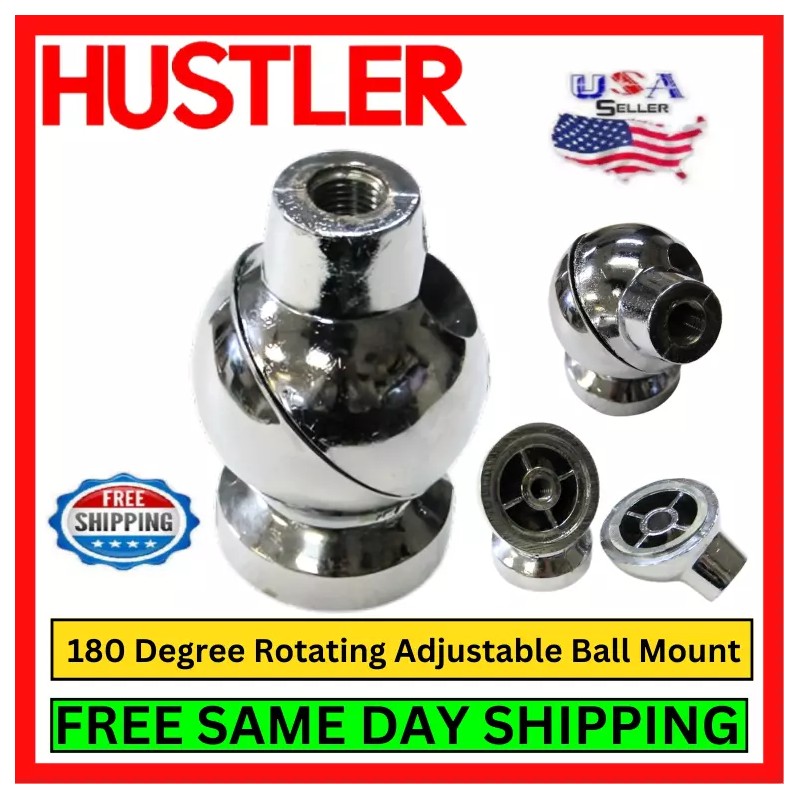 The Hustler C-32 Ball Mount features a 180-degree adjustable design, allowing for flexible positioning to accommodate various installation needs. Constructed from chrome-plated die-cast material, it offers durability and resistance to corrosion. The base is made from high-impact plastic, providing additional strength and stability.