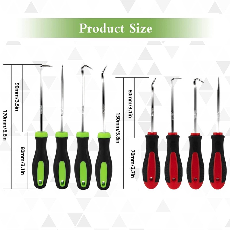 - Kit Included The O-ring puller kit includes 45 degree hook, full hook, straight pick, and 90 degree hook. You can get a total of 8 pieces tools, different types of hooks can meet your different requirements.