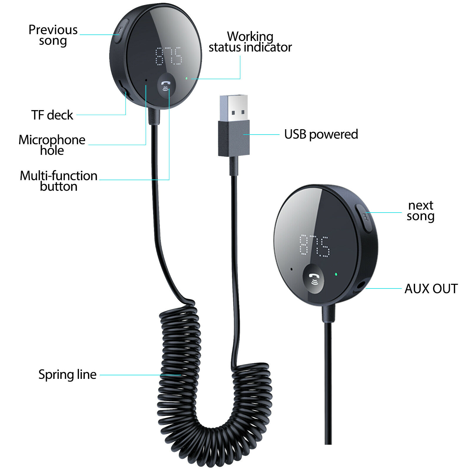Multi-Function & Hands-Free: Play, Pause, Previous song, Next song; Answer and reject calls; High quality microphone is built in to the receiver unit, the hands-free car kit provides a simple solution for answering and receiving phone calls and streaming music from your Bluetooth enabled phones while on the going.