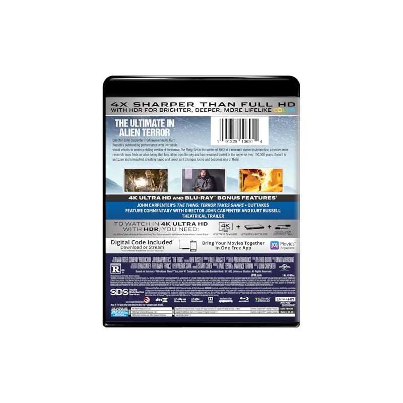 Director John Carpenter (Halloween) teams Kurt Russell's outstanding performance with incredible visual effects to create a chilling version of the classic The Thing. Set in the winter of 1982 at a research station in Antarctica, a twelve-man research team finds an alien being that has fallen from the sky and has remained buried in the snow for over 100,000 years. Soon it is unfrozen and unleashed, creating havoc and terror as it changes forms and becomes one of them.Bonus Content:Includes 4K UHD, Blu-ray and a digital copy of The Thing (1982) (Subject to expiration. Go to NBCUCodes.com for details.) Features High Dynamic Range (HDR10) for Brighter, Deeper, More Lifelike Color John Carpenter's The Thing: Terror Takes Shape Outtakes Theatrical Trailer Feature Commentary with Director John Carpenter and Kurt Russell U-Control: Picture in Picture Feature Commentary with Kurt Russell and Director John Carpenter