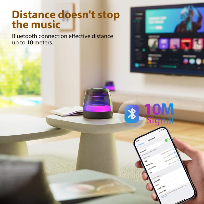 - đ”ăColorful RGB LightingăTo rich and enhance your audio experience, this mini bluetooth speaker is built-in RGB lights, cool lighting syncs with music for an immersive audio-visual feast. Lighting effect will perform well in dingy place and night. Turning off or on the lights as your mind.