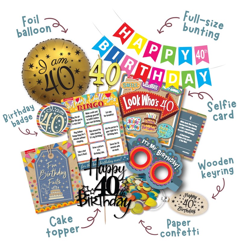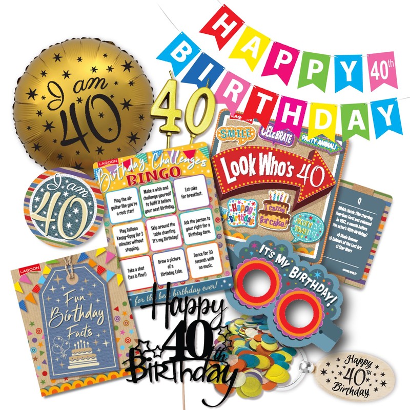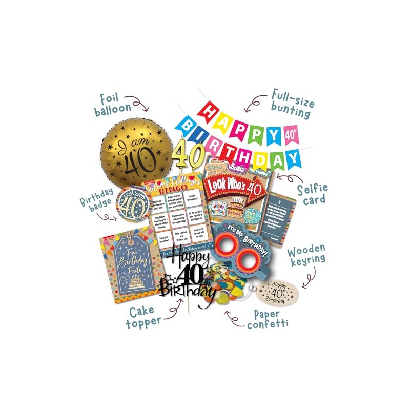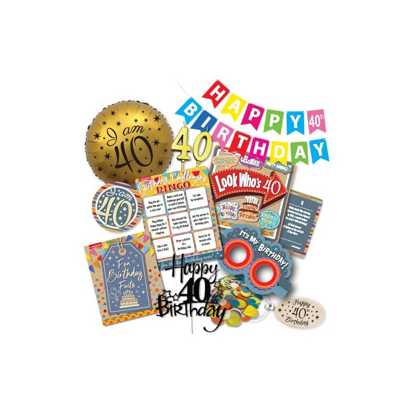 - COMPLETE BIRTHDAY KIT: All-in-one 40th birthday celebration package featuring a collection of festive items including games, decorations, and party accessories