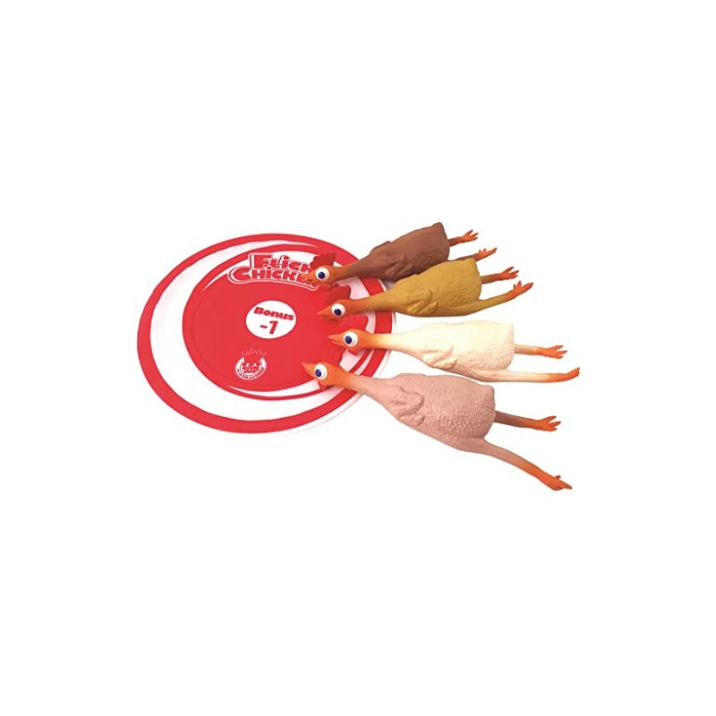 - Includes four rubber chickens, a target disc and score pad