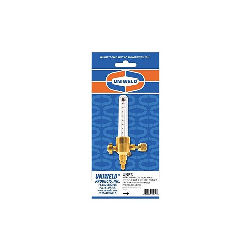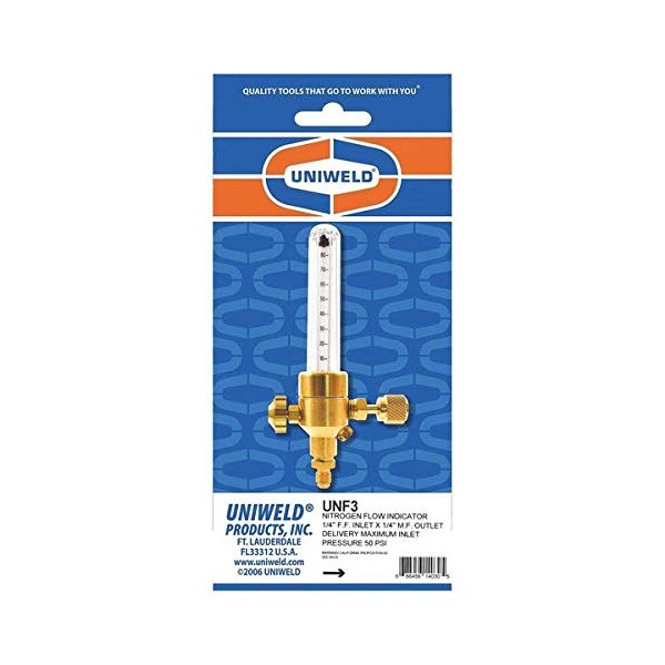 The UNF nitrogen flow indicator is a visual tool that confirms the flow of nitrogen gas through the copper lines during the brazing process. made in United States. Manufactured by uni-weld products, Inc.