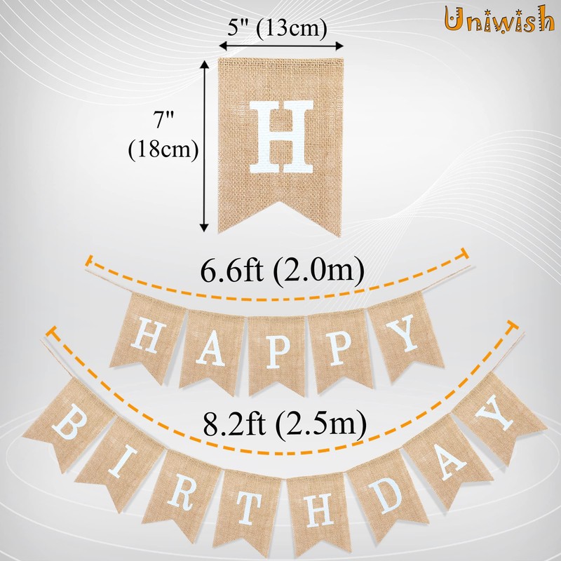 Uniwish Happy Birthday Banner for Birthday Party Decorations, Rustic Burlap Bunting Swallowtail Flags, 2 in 1