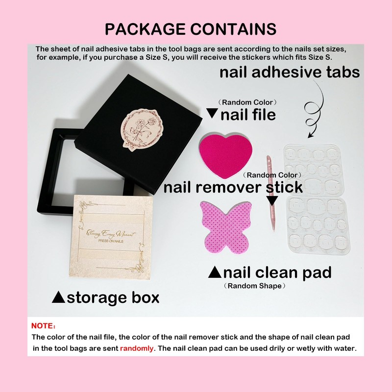 - PACKAGE CONTAINS: 10pcs press on nails handmade and in specific sizes (Please measure your nails size correctly before making an order) +1 sheet of 24pcs nail adhesive tabs+1pc nail remover stick+1pc nail file+2pcs nail clean pads+1pc storage box