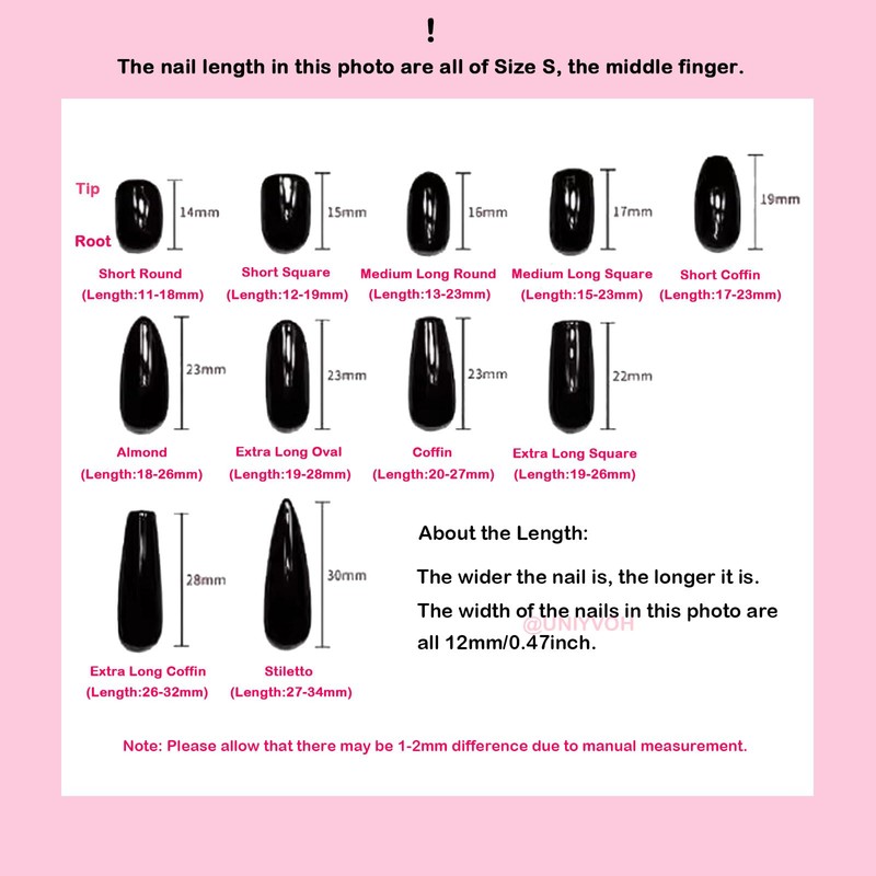 Warm Tips for the Acrylic Artificial Nails: 1.After you finish putting on the fake nails, please keep them away from water within 2 hours if you want it more lasting, and please avoid keeping your hands in water too long. 2.If you want to keep the fake nails reusable, we advise you use jelly stickers better than nail glues. 3.Please measure your nails size correctly before making an order. The “XS/S/M/L”selections on the page means “X-Small/Small/Medium/Large” sizes, NOT nails length. If you want to know how long the false nails are, please refer to the product photos which shows the size chart. 4.Some press on nails have decorations glued on them. We all glue them firmly before sending out, but please understand that they are not grown on it. What if the decoration fell off, you can use glue to stick it on. It doesn’t affect normal use. Thank you for your understanding! 5.The sheet of nail adhesive tabs in the tool bags are sent according to the nails set sizes, for example, if you purchase a Size S, you will receive the stickers which fits Size S. The color of the nail file, the color of the nail remover sticks and the shape of nail clean pads in the tool bags are sent randomly. The nail clean pad can be used drily or wetly with water