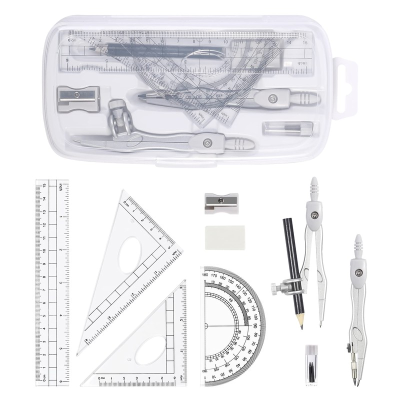 - 10 Piece Geometry Kit Set includes: 2 Metal Study Compasses, 2 Triangles (45° & 30°/60°), 6" Ruler, 4" Protractor, Pencil for Compass, Pencil Sharpener, Eraser, Pencil Lead Refill