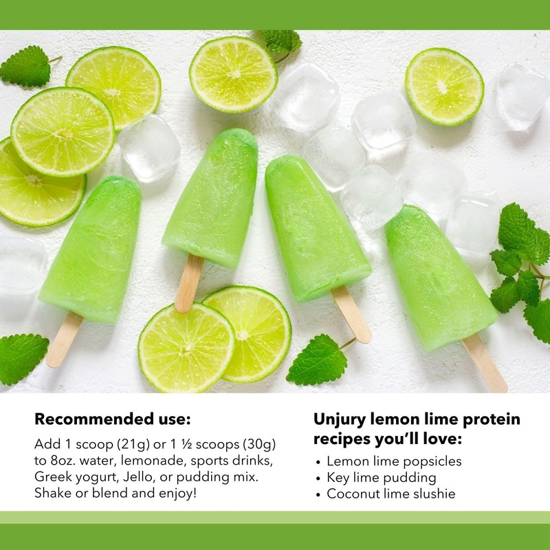 - Unlimited Recipes: Mix Unjury Lemon Lime High Protein Powder with your favorite beverage or recipe. Just put 1 scoop of Unjury Protein Powder into an 8 ounce cup of milk, coffee or any other beverage. Shake, stir or blend and enjoy!. Shake, stir, or blend - and enjoy.