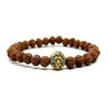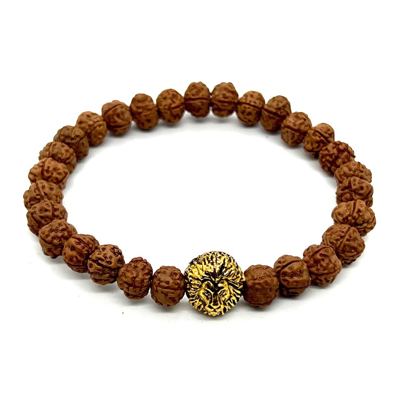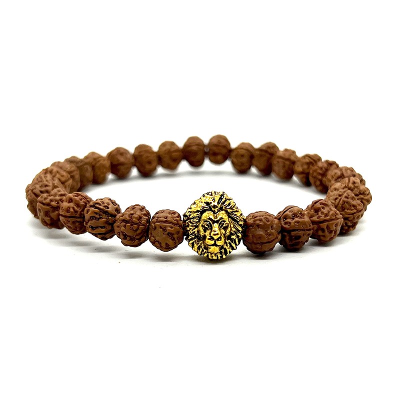 - Embrace Power & Cultivate Stability Channel your inner strength and cultivate a sense of stability with this powerful, handmade stretch bracelet. Featuring genuine 8mm 5 Mukhi Rudraksha beads and a striking golden polished lion head charm, this bracelet offers a stylish and meaningful way to promote Root Chakra balance and spiritual well-being (approximately 7.5 inches wrist size)