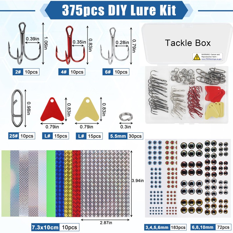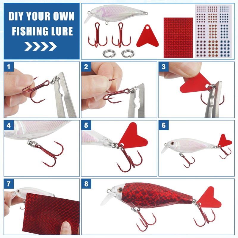 - 【YOU WILL GET】375pcs Unpainted Fishing Lures Making Kit Include 10pcs blank fishing lures,10pcs fishing lure sticker tapes,255pcs 3D 4D lure eyes, 30pcs treble hooks red black silver, 30pcs split rings, 10pcs speed clips, 30pcs heart shape plastic sheets. These hook swivel ring accessories are packaged in an individually reusable box.