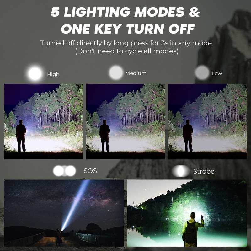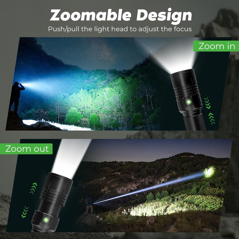 - 【Zoomble Flash Light&5 Modes&Memory Function】:Our tactical flashlight has 5 modes:High/Medium/Low/Strobe/SOS.Short press the power button to switch modes,long press for 2s to turn off the powerful flashlight,The zoomable flashlight is capable to change the focus,getting flood beam or spot beam to widden or narrow the range of the area covered by light.