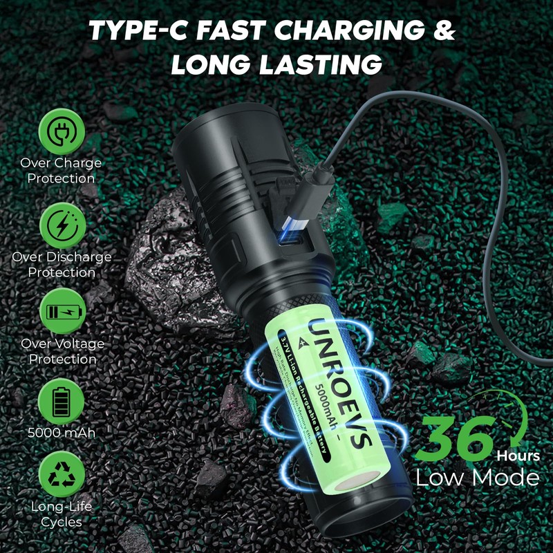 - 【Type-C Rechargeable】:This LED Flashlight is equipped with a USB-C fast charging port,Equipped with 5000mAh rechargeable battery, it only takes 2.5 hours to fully charge. Red and Green battery indicator light let you know the battery level at any time.