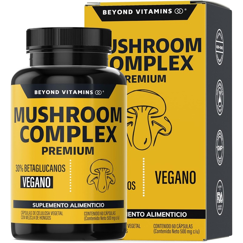 Beyond Vitamins | Mushroom Complex Premium con exclusiva mezcla de 6 hongos adaptógenos | Extractos altos en Betaglucanos, Polisacáridos y Triterpenos para resultados óptimos | Melena de León, Cordyceps, Reishi, Maitake, Chaga y Coriolus Versicolor | 2 meses