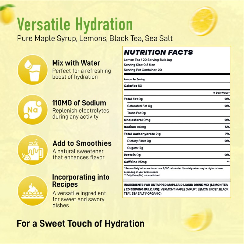 - Crisp & Energizing: Lemon Tea Mapleaid offers the crisp taste of real lemons combined with organic black tea for a natural caffeine boost. Made with pure maple syrup and sea salt, this liquid concentrate provides refreshing hydration and electrolytes in every sip.