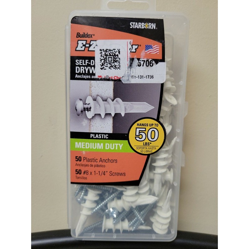 Plastic E-z Ancor Kit #50 Self Drilling Drywall Anchor Set with 1.25 inches NEW.